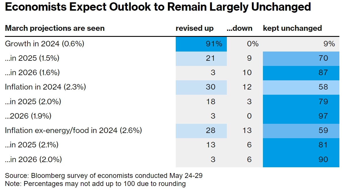 这一次,除了在第一季度经济增长好于预期后提高了对2024年经济扩张的预期外,受访者预计欧洲央行不会调整预测。