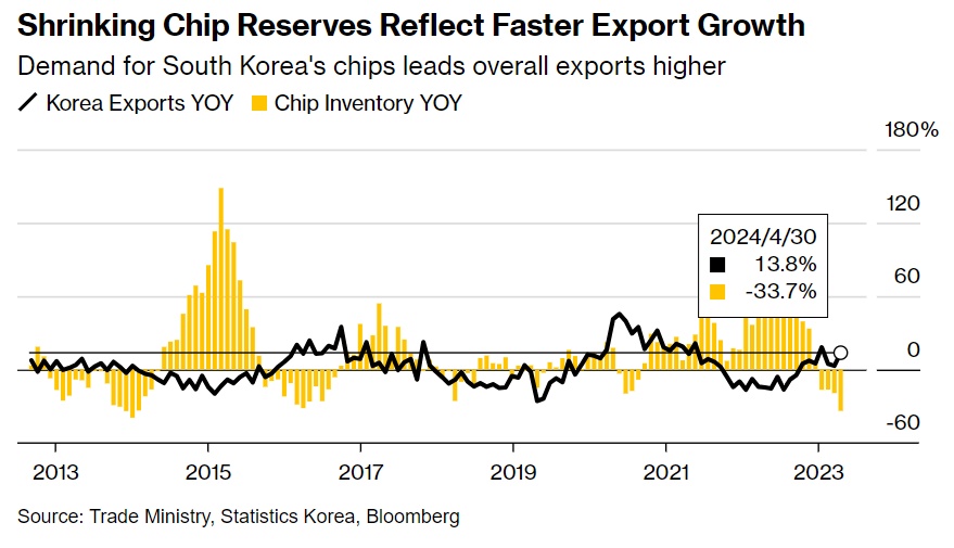 芯片储备缩减反映出口增长加快——对韩国芯片的需求带动了整体出口的上升趋势