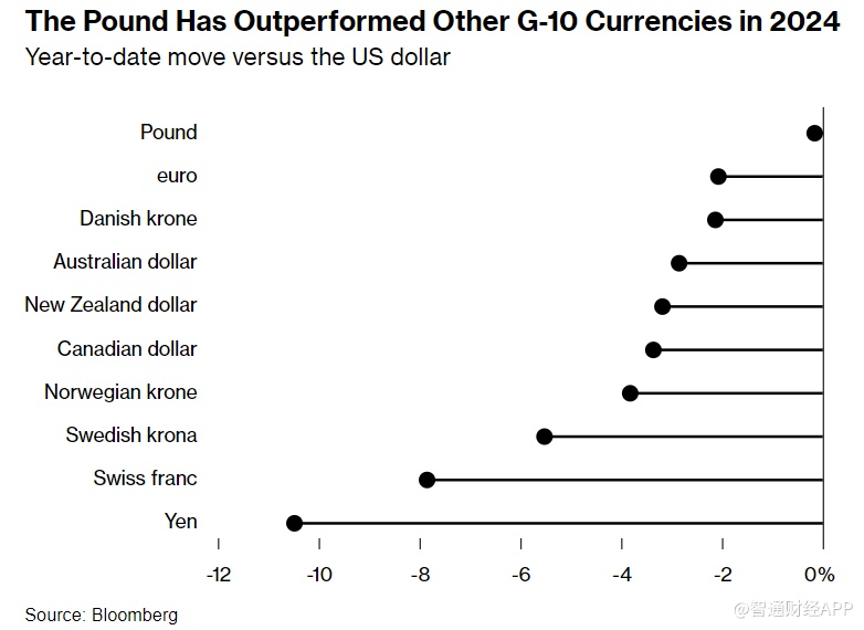 英镑兑美元今年在10国集团货币中表现最佳,因为市场越来越预期英国央行降息时间将落后于其他许多央行。上周宣布的选举消息并未动摇这一论调。