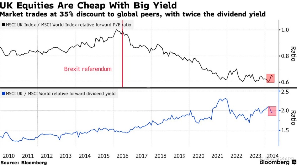 尽管如此,根据Bloomberg汇编的数据,英国股票相对于发达市场股票的折价率仍接近历史最低水平,即便股息收益率是发达市场股票的两倍。