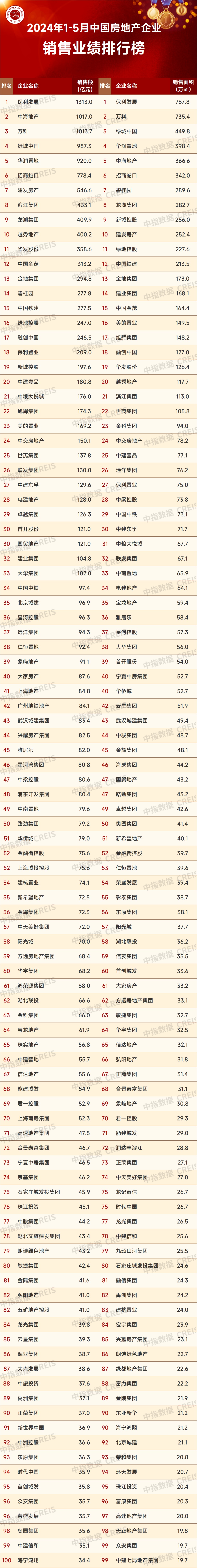 智通财经APP获悉,5月31日,中指研究院发布2024年1-5月中国房地产企业销售业绩排行榜。其中,按销售额计,保利发展(600048.SH)位列榜首,第二至第十名分别为中海地产、万科(000002.SZ)、绿城中国(03900)、华润置地(01109)、招商蛇口(001979.SZ)、建发房产、滨江集团、龙湖集团(00960)、越秀地产(00123)。数据显示,2024年1-5月,TOP100房企销售总额为16184.5亿元,同比下降但降幅较上月继续收窄。5月份,典型企业如绿城中国、中建壹品等销售增长强劲。