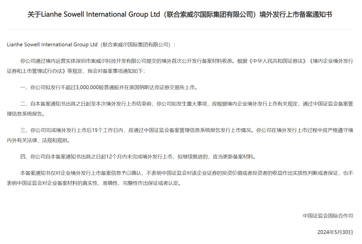 智通财经APP获悉,5月30日,中国证监会发布关于Lianhe Sowell International Group Ltd(联合索威尔国际集团有限公司)境外发行上市备案通知书。该公司拟发行不超过3,000,000股普通股并在美国纳斯达克证券交易所上市。资料显示,索威尔(LHSW.US)成立于2007年,主要提供机器视觉产品和解决方案,发明并整合了各种应对关键制造和分销挑战的技术及解决方案。