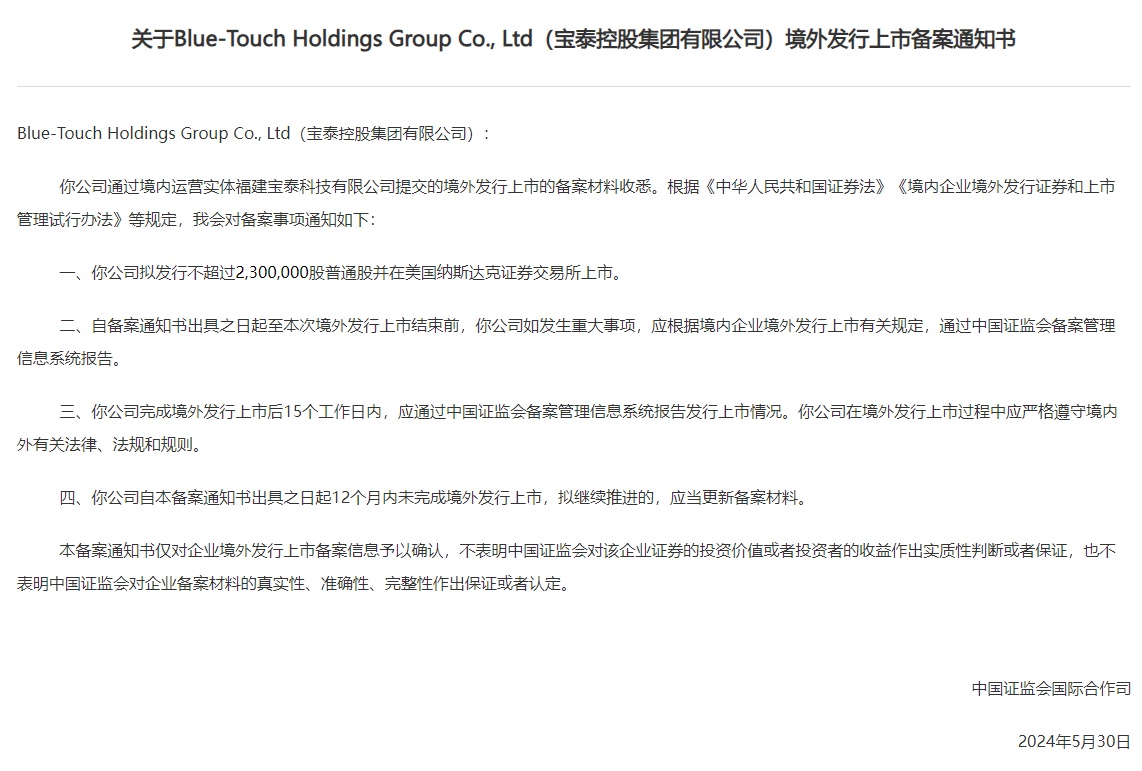 智通财经APP获悉,5月30日,中国证监会发布《关于Blue-Touch Holdings Group Co.,