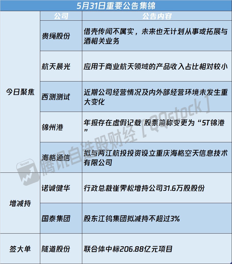 锦州港公告,收到中国证监会下发的《行政处罚及市场禁入事先告知书》,锦州港2018年至2021年年度报告存在虚假记载,证监会决定对公司责令改正,给予警告,并处以800万元罚款等。公司股票6月3日开市起停牌1天,6月4日复牌,A股股票简称变更为“ST锦港”。