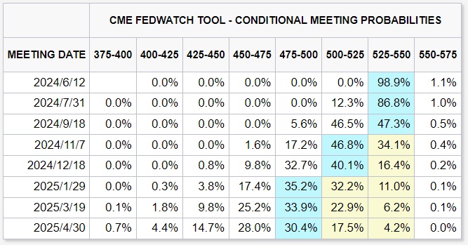 数据公布后,美国国债收益率走低,标普500指数期货上涨,美元指数下跌。掉期交易员仍预计美联储今年至少会降息一次。市场已经降低了对今年降息的预期。定价显示,美联储可能要到11月才会首次降息,届时美联储将在总统大选结束两天后召开会议。