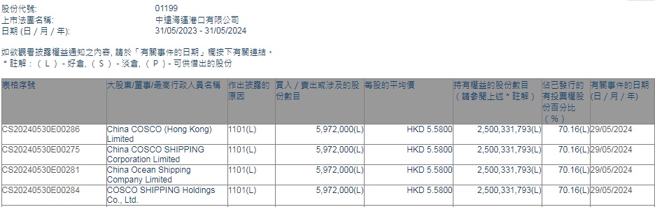 智通财经APP获悉,香港联交所最新资料显示,5月29日,China cosco(Hong kong)Limited增持中远海运港口(01199)597.2万股,每股作价5.58港元,总金额约为3332.38万港元。减持后最新持股数目约为25.00亿股,最新持股比例为70.16%。