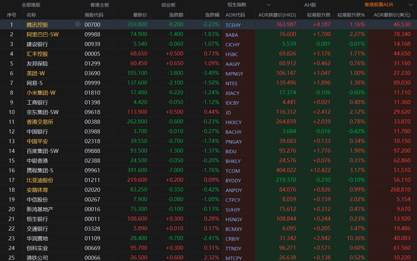 大型蓝筹股涨跌不一,汇丰控股收报69.826港元,较香港收市涨1.71%;腾讯控股收报363.987港元,较香港收市涨1.16%。