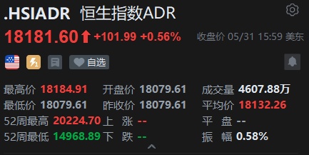 智通财经APP获悉,周五美股三大指数涨跌不一,恒生指数ADR上涨,按比例计算,收报18181.60点,较香港收市上涨101.99点或0.56%。