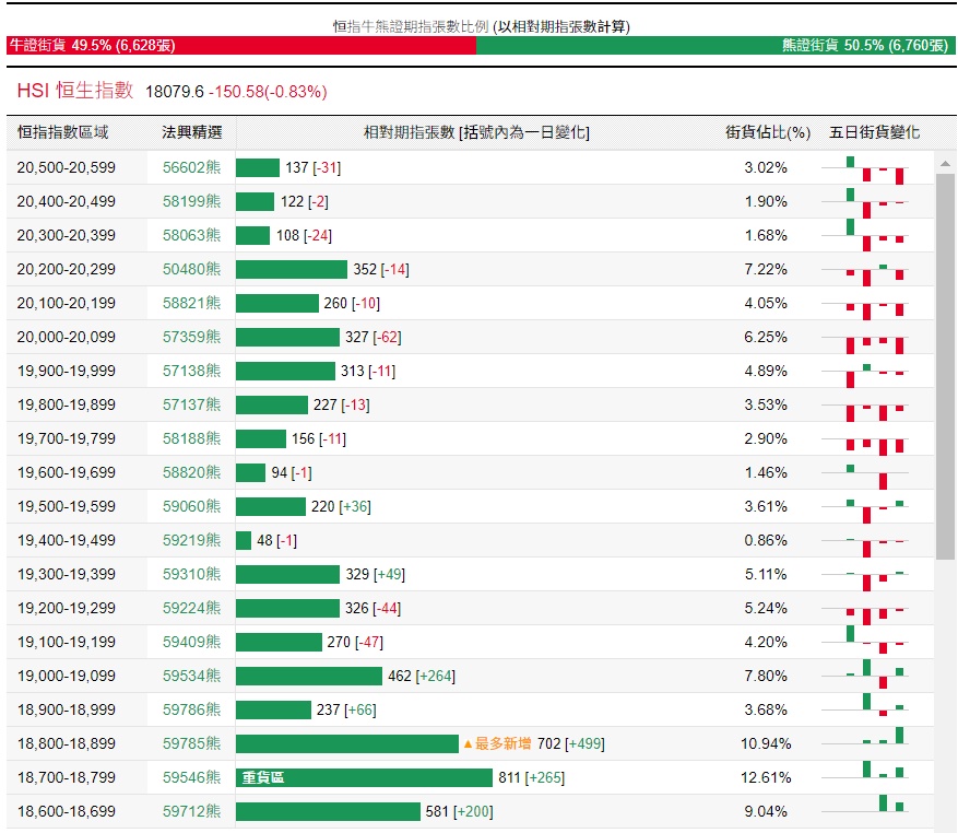 法兴恒指牛熊证街货分布图中的数据显示,熊证街货重货区在18700-18799区间,该区间最新熊证数量为811张,较上一交易日增加265张;最多新增在18800-18899区间,该区间最新熊证数量为702张,较上一交易日增加499张。