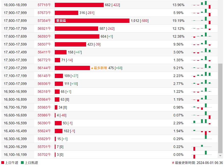 牛证街货重货区在17800-17899区间,该区间最新牛证数量为1012张,较上一交易日减少580张;最多新增在17200-17299区间,该区间最新牛证数量为475张,较上一交易日增加68张。
