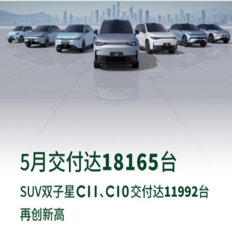 智通财经APP获悉,零跑官方微博宣布,5月交付达18165台。其中,SUV双子星C11、C10交付11992台,创新高。超舒适智能6座SUV C16将于6月正式上市。