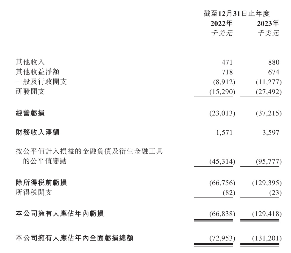 财务方面,于往绩记录期,公司产生净亏损。截至2022年及2023年12月31日止两个年度,公司的年内亏损分别约为6683.8万美元及1.29亿美元。此外,公司研发开支由2022年的1529万美元增加至2023年的2749.2万美元。