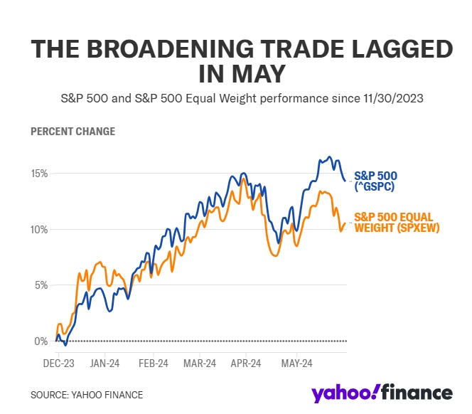 此外,在美国股市最近屡创新高的行情中,投资者们关注的市场广度令人担忧。美国银行投资策略师Michael Hartnett在评估等加权标准普尔500指数与市值加权标准普尔500指数走势的密切程度时指出,市场广度处于2009年以来的最差水平。数据显示,自5月初以来,标普500指数上涨了约4%,而等权重标普500指数的涨幅还不到2%。