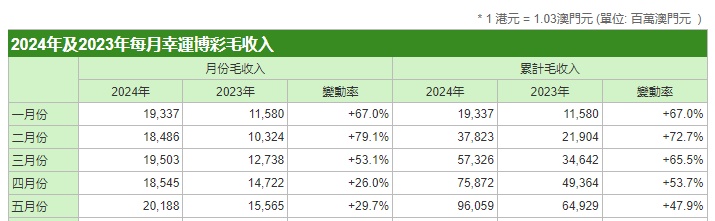智通财经APP获悉,澳门博彩监察协调局公布,5月份幸运博彩毛收入按年升29.7%至201.88亿澳门元,是自2020年1月以来首次,并且是疫情以来最高水平,主要受惠于内地五一黄金周带动。今年首五个月,澳门幸运博彩毛收入累计达960.59亿澳门元,按年升47.9%。