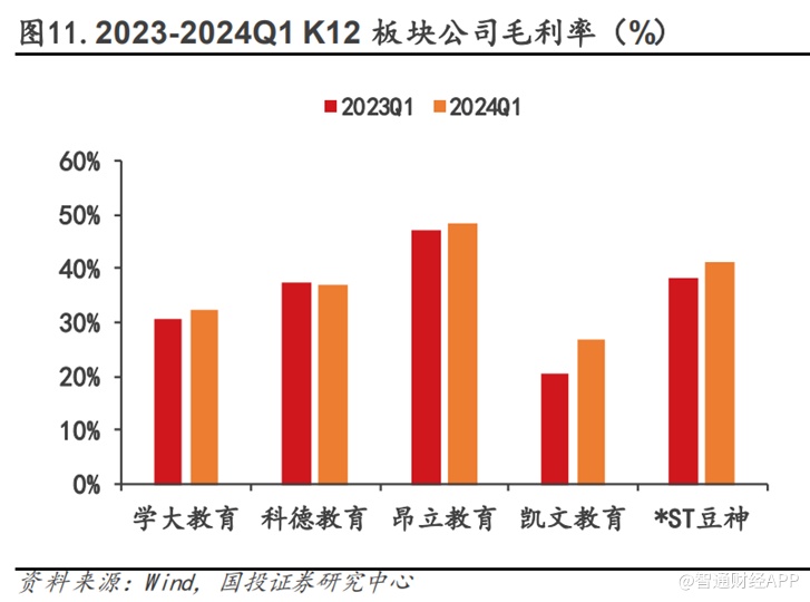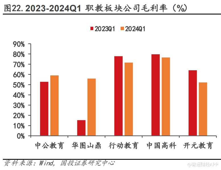 而在职业教育板块,2023年除了华图山鼎(300492.SZ)因非学历培训业务开展处于投入期导致录得亏损、及传智教育(003032.SZ)受招聘市场扰动影响报班人数下滑导致盈利下降,中公教育、行动教育(605098.SH)毛利率分别同比增长15.9和3.1个百分点。2024年Q1,华图山鼎、中公教育盈利能力继续上升,毛利率分别同比增加40.3、6.1个百分点,净利率同比增加27.4与8.1个百分点。
