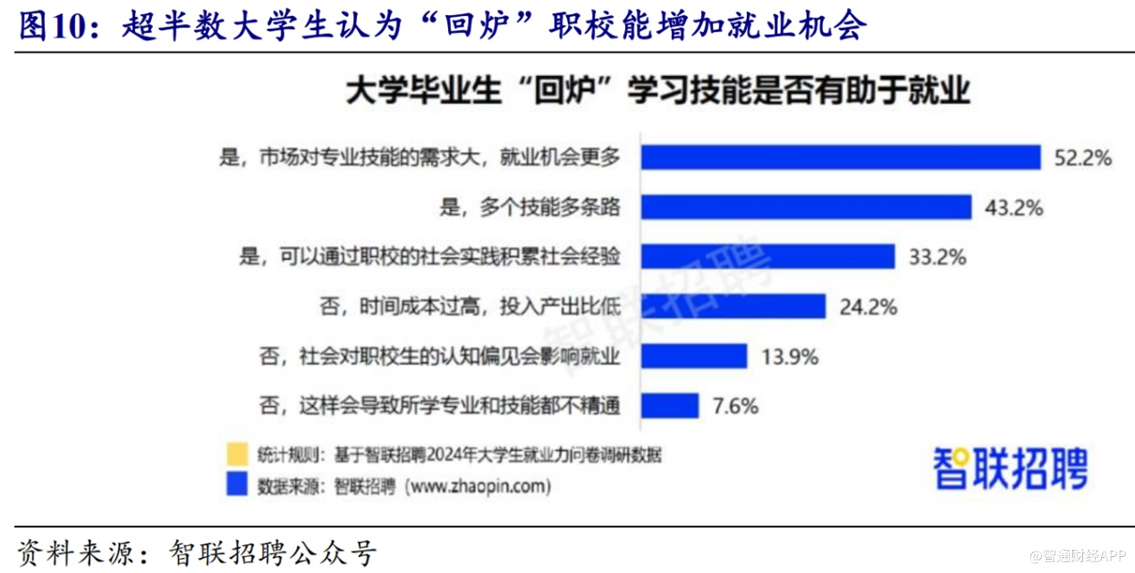 据智通财经APP了解,近日智联招聘发布的《大学生就业力调研报告》显示,多数大学生对职业教育认可度正在提升,亦从侧面佐证了职业教育市场渗透率有望进一步提高。报告显示,对于“回炉”学习技能是否有助于就业这一问题,52.2%的毕业生给出了肯定答案,认为市场对专业技能需求大,“回炉”后就业机会更多,占比最高;其次,43.2%认为多个技能多条路,33.2%认为可以以此积累社会经验。