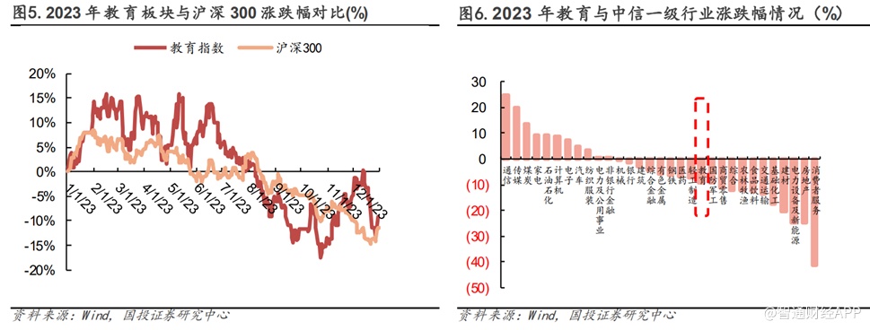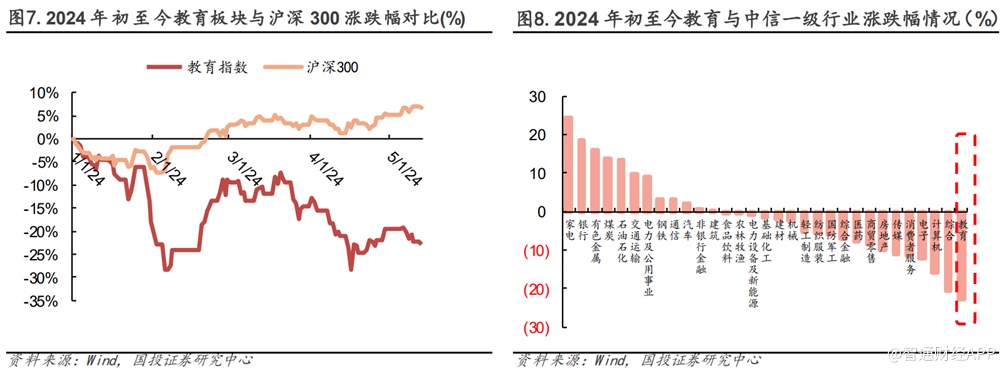 据国投证券复盘教育行业2023年以来的市场表现,教育中信指数(CI005816.WI)2023年累计涨跌幅下跌9.15%,分别跑输沪深300和上证综指11.44和19.12个百分点;2024年年初以来(2024/1/1-2024/5/13)累计涨跌幅下跌22.82%,分别跑输沪深300和上证综指29.63和28.64个百分点,与大盘差距继续拉大。
