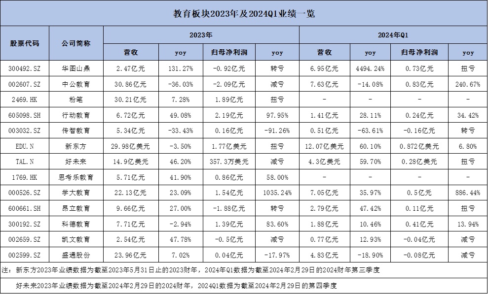 根据智通财经APP了解,2024年第一季度,多数教育板块公司延续了2023年以来的较高景气度,多家公司实现大幅增长、扭亏、减亏。