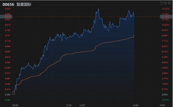 6月3日,复星国际(00656)交易期间股价保持高位拉升,截至发稿,盘中最高涨幅超15%。同时,其旗下核心子公司之一复星医药(02196)港股当日亦上涨近8%。