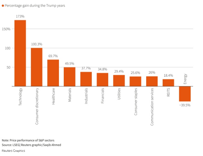 在特朗普的第一任期内,标普500指数上涨了68%,这一涨幅得益于他的减税和基础设施支出政策,尽管期间发生了贸易战和新冠疫情。而拜登上任后,该指数迄今已上涨38%。