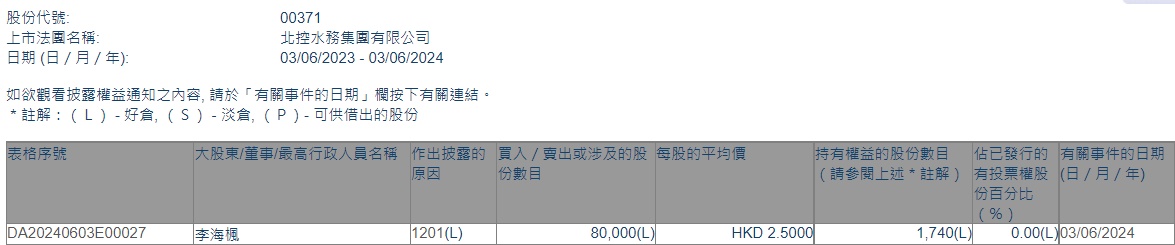 智通财经APP获悉,香港联交所最新资料显示,6月3日,执行董事兼副总裁李海枫减持北控水务集团(00371)8万股,每股作价2.5港元,总金额20万港元。减持后最新持股数目1740股,最新持股比例为0.00%。