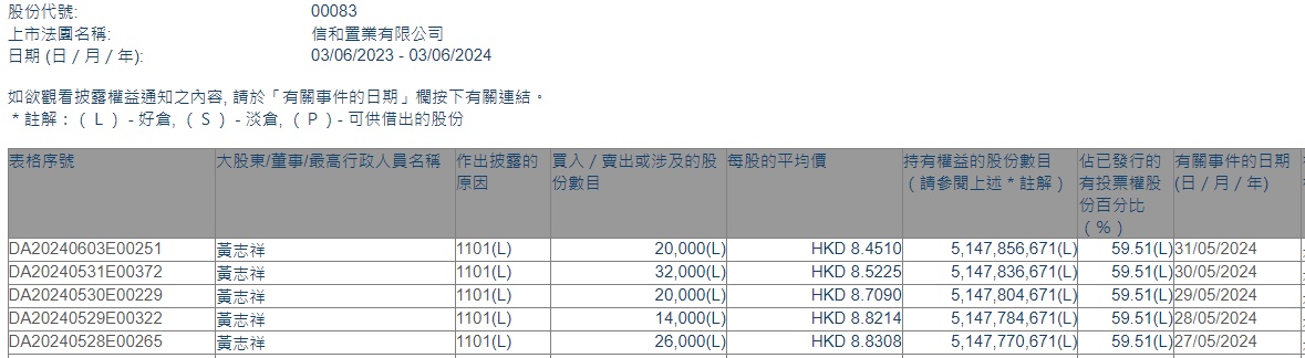 智通财经APP获悉,香港联交所最新资料显示,5月27-31日,主席黄志祥分别增持信和置业(00083)2.6万股、1.4万股、2万股、3.2万股、2万股,每股作价分别为8.8308港元、8.8214港元、8.7090港元、8.5225港元、8.4510港元,总金额约为96.90万港元。增持后最新持股数目约为51.48亿股,持股比例为59.51%。