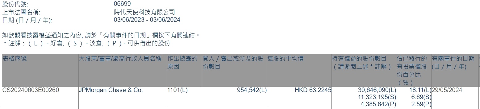 智通财经APP获悉,香港联交所最新资料显示,5月29日,小摩增持时代天使(06699)95.4542万股,平均每股作价为63.2245港元,总金额约为6035.04万港元。增持后最新持股数目约为3064.61万股,最新持股比例为18.11%。