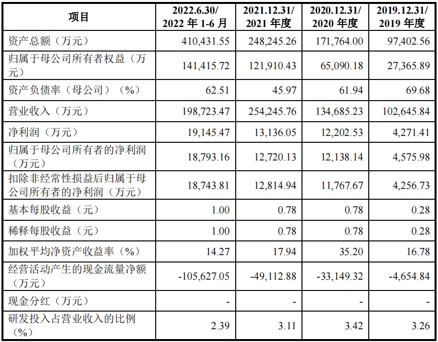 财务方面,公司于2019年、2020年、2021年、及2022年上半年分别实现营收约10.26亿、13.47亿、25.42亿、19.87亿人民币,净利润分别约为4271.41万、1.22亿、1.31亿、1.91亿人民币。