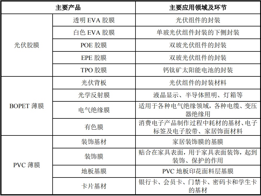 据招股书,百佳年代是一家从事功能性薄膜研发、生产和销售的高新技术企业。自2007年成立一来,公司一直专注于功能性薄膜行业,经过在功能性薄膜行业超过15年的深耕,公司已经形成了“产品种类丰富、下游应用广泛、核心产品突出”的良好局面。目前,公司主要产品包括光伏胶膜、BOPET薄膜、PVC薄膜、PC薄膜、胶粘剂及涂层材料等,公司产品广泛应用于光伏组件、消费电子和家居装饰等行业。