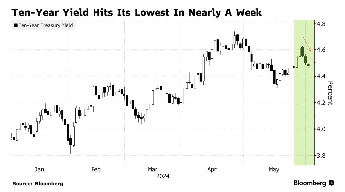 10年期美国国债收益率连续第三天下跌,跌幅高达4个基点,至4.46%,为5月28日以来的最低水平。两年期国债收益率变化不大,为4.87%。欧洲债券也全线上涨,因为该地区的制造业PMI数据大多略低于预期。