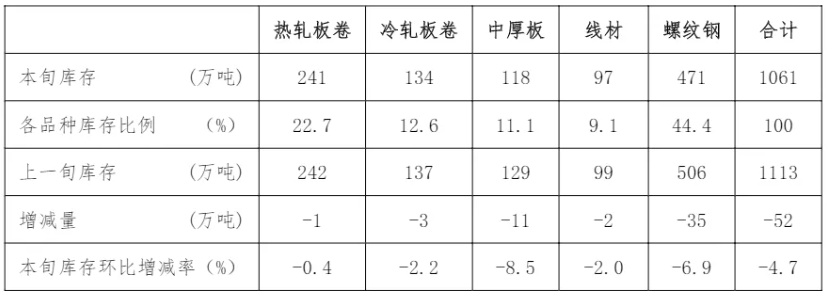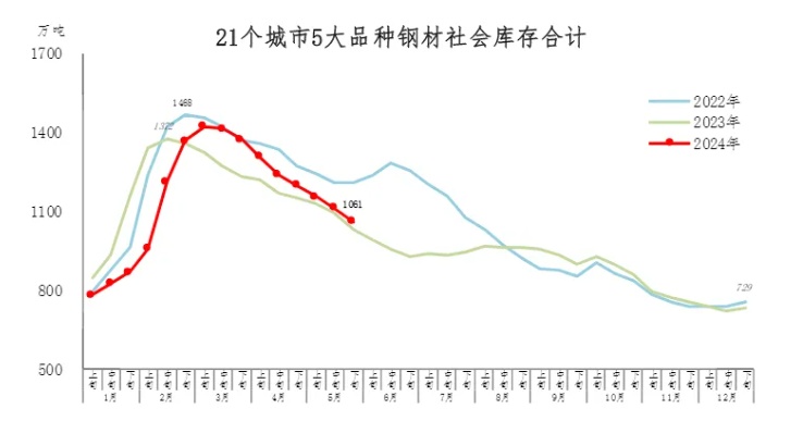 智通财经APP获悉,6月3日,中钢协数据显示,5月下旬,21个城市5大品种钢材社会库存1061万吨,环比减少52万吨,下降4.7%,库存持续下降;比4月下旬减少138万吨,下降11.5%;比年初增加332万吨,上升45.5%;比上年同期增加30万吨,上升2.9%。