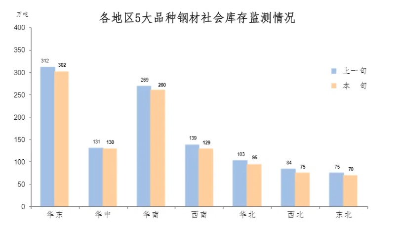 5月下旬,分地区来看,七大区域库存环比均有不同程度下降,具体情况为:西南、华东库存均环比减少10万吨,为减量最大地区,分别下降7.2%和3.2%;西北减少9万吨,下降 10.7%,为降幅最大地区;华南减少9万吨,下降3.3%;华北减少8万吨,下降7.8%;东北减少5万吨,下降6.7%;华中减少1万吨,下降 0.8%。