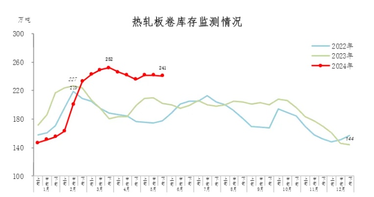 5月下旬,热轧板卷库存241万吨,环比减少1万吨,下降0.4%,库存高位波动;比4月下旬增加5万吨,上升 2.1%;比年初增加97万吨,上升67.4%;比上年同期增加39万吨,上升19.3%。