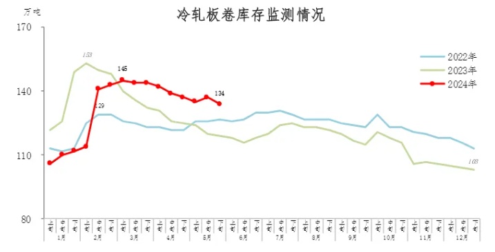 5月下旬,冷轧板卷库存134万吨,环比减少3万吨,下降 2.2%,库存由升转降;比4月下旬减少3万吨,下降2.2%;比年初增加 31万吨,上升30.1%;比上年同期增加 15 万吨上升 12.6%。