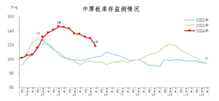 5 月下旬,中厚板库存118万吨,环比减少11万吨,下降8.5%,库存降幅扩大;比4月下旬减少 17万吨,下降 12.6%;比年初增加 24万吨,上升25.5%;比上年同期增加23 万吨,上升 24.2%。