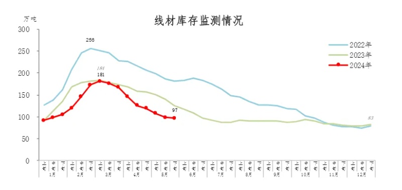 5月下旬,线材库存97万吨,环比减少2万吨,下降2.0%,库存降幅收窄;比4月下旬减少22万吨,下降18.5%;比年初增加 14万吨,上升16.9%;比上年同期减少 29 万吨,下降23.0%。