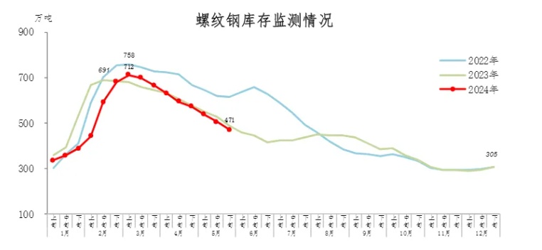 5月下旬,螺纹钢库存471万吨,环比减少35万吨,下降6.9%,库存持续下降;比4月下旬减少101万吨,下降17.7%;比年初增加 166 万吨,上升 54.4%;比上年同期减少 18 万吨,下降 3. 7%。