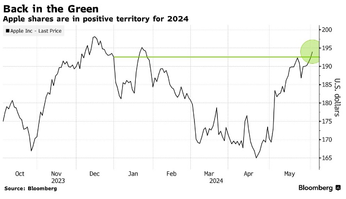 苹果股价近期的强势很大程度上是在5月初发布季度报告后出现的,当时苹果给出了乐观的预测,缓解了人们对其增长趋势和在华销售的担忧。该公司还宣布了美国历史上规模最大的股票回购计划,价值1100亿美元。