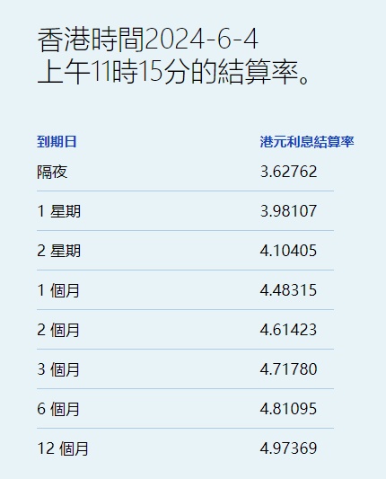 智通财经APP获悉,6月4日,港元拆息全线走低,其中,隔夜息进一步跌至3.62762%,创近三周新低。一星期拆息低见3.98107%,而与楼按相关的一个月拆息亦回落至4.48315%。