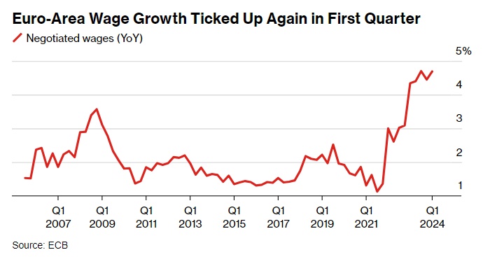最新的经济报告提供了谨慎的理由。政策制定者原本希望欧元区薪资的一项关键指标显示通胀终于得到了控制,但却未能得到缓和,这表明价格压力,尤其是服务业的价格压力,可能需要更长的时间才能缓解。事实上,上个月通胀率从4月份的2.4%上升到2.6%,超过了分析师预期。