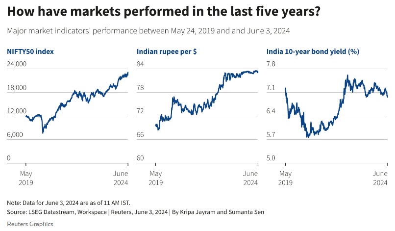 自2014年5月莫迪担任总理以来,截至周一收盘,基准指数的价值已经增加了两倍多。