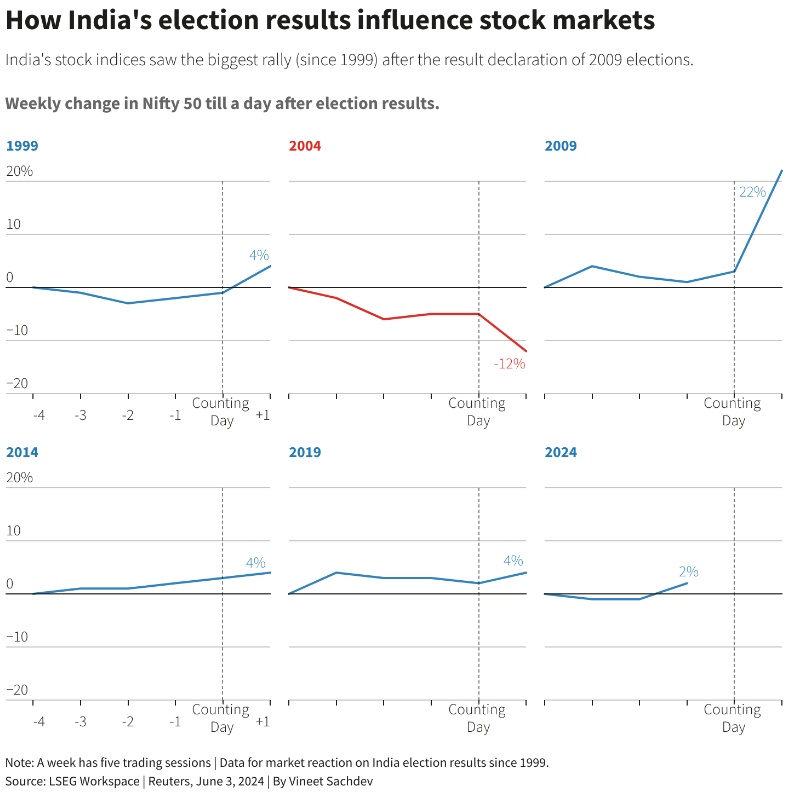 智通财经APP注意到,周二,印度资本市场遭遇股债汇三杀。正在开票中的2024年印度大选初步计票结果显示,印度总理莫迪领导的执政党印度人民党(BJP)主导的全国民主联盟(NDA)的优势并未达到此前民调和市场预期的那样强劲。