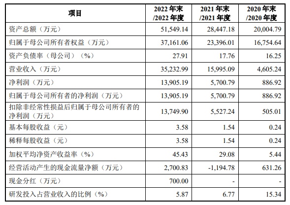 财务方面,于2020年度、2021年度以及2022年度,赢双科技实现营业收入分别约为4605.24万元、1.60亿元以及3.52亿元,同期,该公司实现净利润分别为886.92万元、5700.79万元以及1.39亿元。