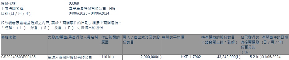智通财经APP获悉,香港联交所最新资料显示,5月31日,长城人寿增持秦港股份(03369)200万股,平均每股作价为1.7902港元,总金额为358.04万港元。增持后最新持股数目为4324.2万股,持股比例为5.21%。