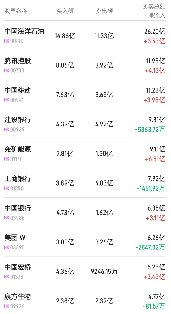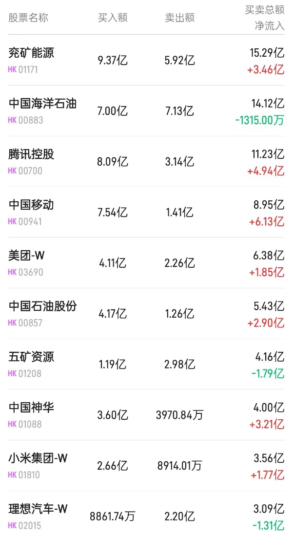 北水净买入最多的个股是中国移动(00941)、兖矿能源(01171)、腾讯(00700)。北水净卖出最多的个股是五矿资源(01208)、理想汽车-W(02015)、建设银行(00939)。