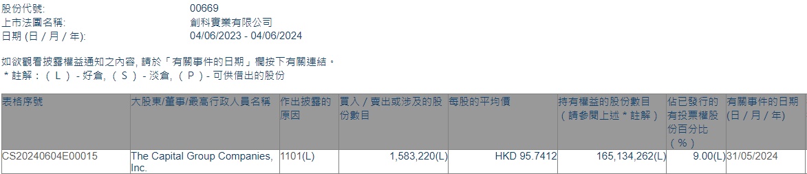 Inc.)增持创科实业(00669)158.322万股,平均每股作价为95.7412港元,总金额约为1.52亿港元。增持后最新持股数目约为1.65亿股,持股比例为9%。