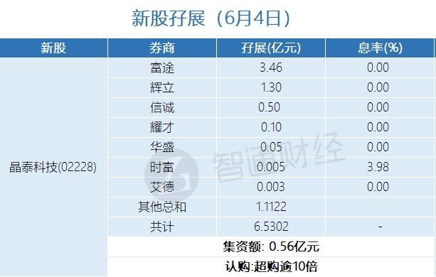 智通财经APP获悉,晶泰科技(02228)正在招股中。截至6月4日,辉立、富途等券商合计分别为晶泰科技借出孖展6.5302亿港元,认购超购逾10倍。