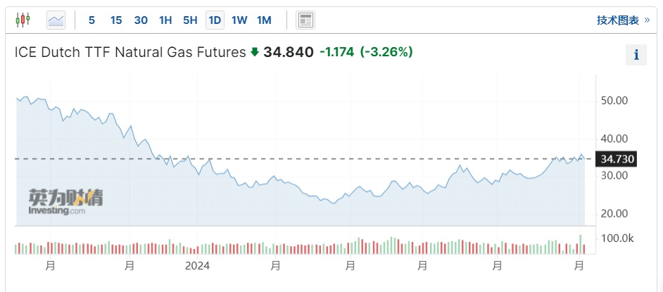 数据显示,欧洲基准天然气价格一度下跌约4%,至34.93欧元/兆瓦时。周一,该合约价格因供应中断飙升至38.56欧元/兆瓦时,为去年12月以来的最高水平。