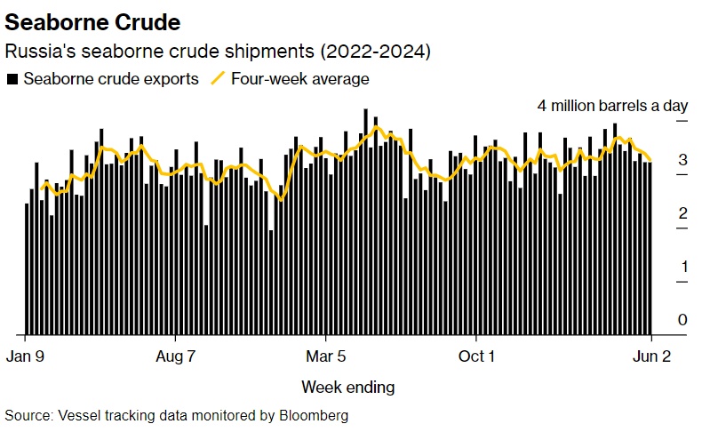 今年迄今为止的俄罗斯原油出货量则比2023年的平均水平高出约5000桶/日。