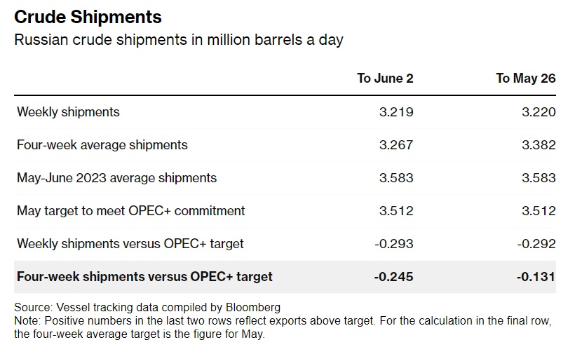 此前的统计数据显示,俄罗斯4月份的日原油出口量比当月设定的减产目标值高出约12万桶,但5月份的日出口量比另一个限制幅度较少的目标低了约17万桶。值得注意的是,从本月开始,俄罗斯不再有当月出口目标设定,因为俄罗斯与欧佩克+成员国达成一致,用欧佩克更青睐的简化产量限制取代了更加复杂的产量和出口上限组合。